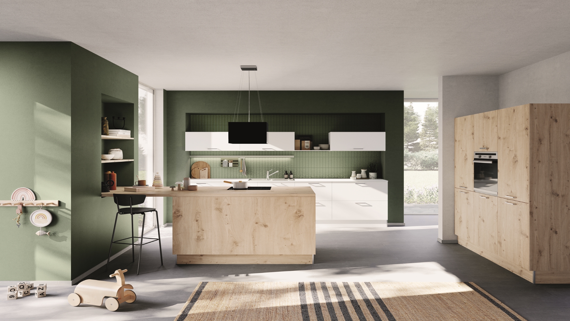 Jasny dąb zestawiony z idealnie miękką, białą fakturą. W tej kuchni ważne jest na dobre samopoczucie, które zapewniają naturalne kolory. Tutaj wszystko do sibie pasuje: kształty, kolory, faktury i ich zestawienie. Zastosowany laminat balijskiego, letniego dębu wycisza kompozycje i podkreśla naturalny charakter. Kuchnie Häcker kładą duży nacisk na interakcję kształtu i koloru tworząc kuchnie z charakterem. Zapewnia to nie tylko przemyślany projekt i najnowocześniejsza technologia produkcji, ale także wysokiej jakości fronty kuchenne, pomysłowe powierzchnie i nietuzinkowe materiały. Designerska kuchnia, w której spotykają się drewniane fronty z żywą zielenią i czysta bielą tworząc świeżą i zapraszającą atmosferę. Centralnym punktem jest wyspa kuchenna, praktyczne szuflady oferują dużo miejsca do przechowywania. Metalowe uchwyty nakładane tworzą sprytny akcent i przełamują linearność kuchni. Wysoka bezuchwytowa zabudowa mieści w sobie wszystkie potrzebne urządzenia i zapewnia dodatkowe miejsce w szafkach.