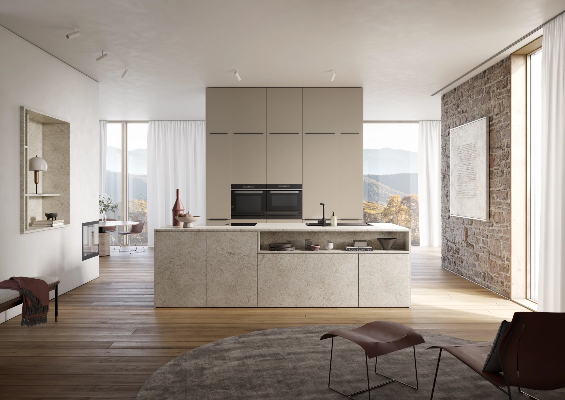 Funkcjonalne połączenie dużej wyspy jako miejsca 'roboczego' z wysoką zabudową mieszcząca sprzęty i oferującą dużo miejsca do przechowywania to jeden z prostych – ponadczasowych pomysłów na kuchnię. Zabudowa nie przytłacza i oferuje dużo możliwości kompozycji estetycznych a przy okazji dzięki prostym rozwiązaniom zyskujemy na funkcjonalności. Wyspa w której zastosowano ten sam materiał na fronty i blat sprawia wrażenie kamiennego monolitu kontrastując z stonowana kolorystyką wysokiej zabudowy będącej przyjemnym tłem.