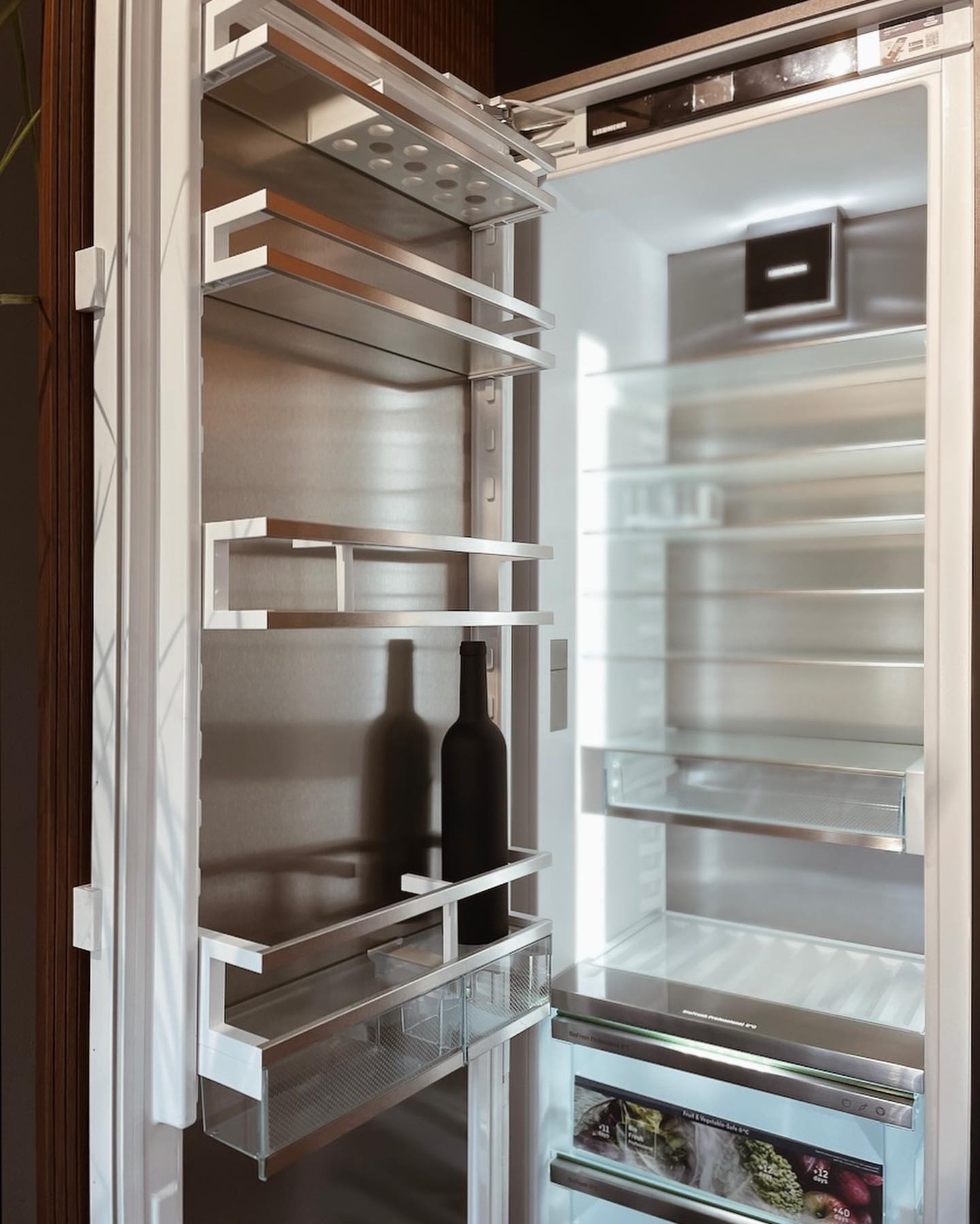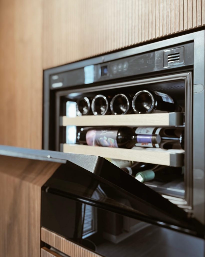 Wysoka zabudowa z forniru dedykowana pod sprzęty do zabudowy (wysoka chłodziarka, zamrażarka, chłodziarka na wino, szuflada na akcesoria, piekarnik oraz wysoka szuflada grzewcza)