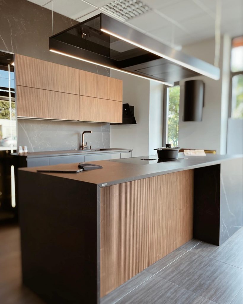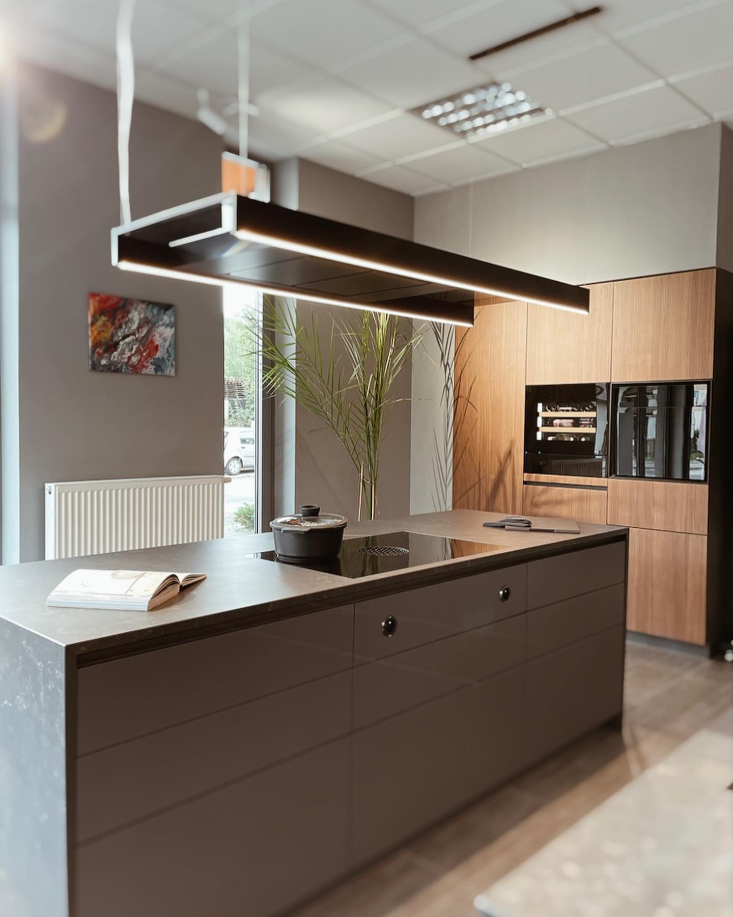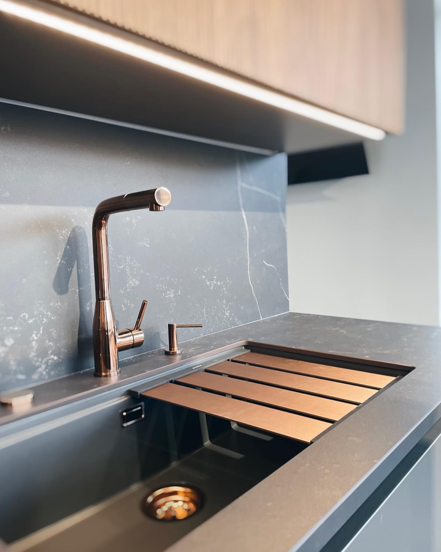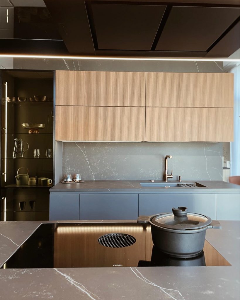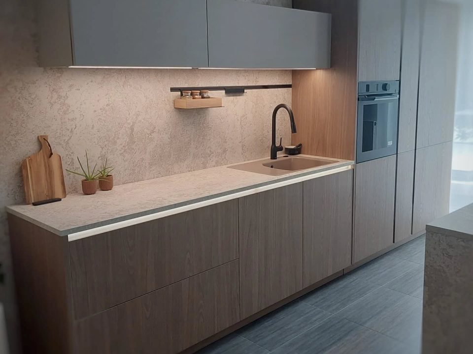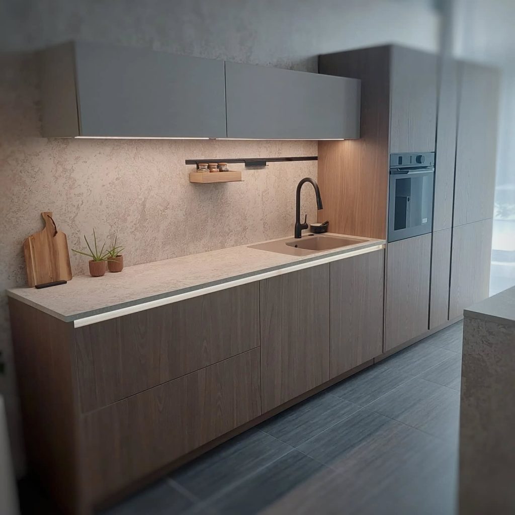 Szafki górne wykonane z forniuru z oświetleniem LED pod szafkami, frontem 'łamanym’ oraz wygodnym systemem otwierania w postaci dyskretnej listwy podchwytowej