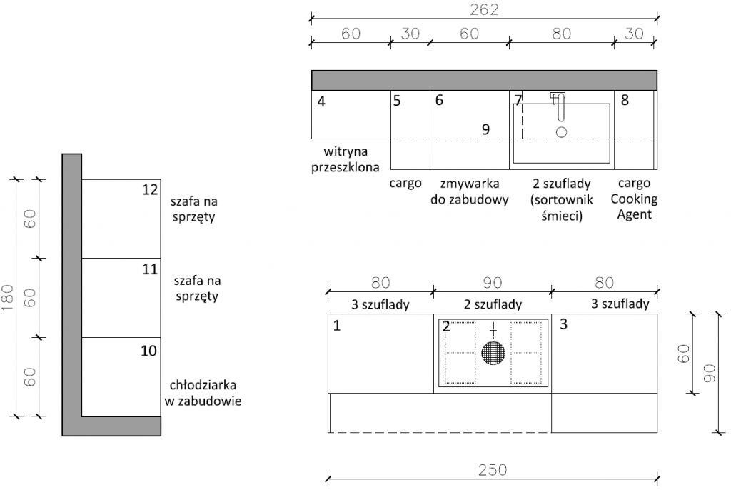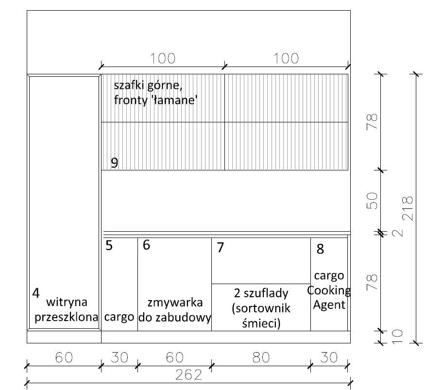 2 szafki górne, z frontem 'łamanym’, praktyczną listwą podchwytową w celu wygodnego otwierania, 3 półki